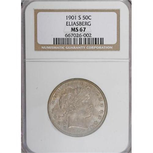 <B>1901-S 50C MS67 NGC.</B></I> Ex: Eliasberg. The San Francisco Mint's output of half dollars in 1901 amounted to just 847,044 pieces. Writing in 1991, David Lawrence opined that the '01-S is the rarest Barber half in Mint State after the 1904-S and 1896-O. The Superb Gem offered here is typically bold and displays peerless surfaces under a coating of mottled dove-gray patina. Perhaps no other pedigree in U.S. numismatics is as illustrious as those originating from the Eliasberg Collection. It is well known that J.M. Clapp and his son John obtained branch mint coinage from the late 19th and early 20th centuries was obtained by directly from the various mints. Many of the finest known silver and gold coins from this era are the beneficiary of this practice, this coin included.<BR> The Bowers and Merena cataloger wrote of this lot, which was graded MS-66 in the Eliasberg Collection, "Light champagne and freckled gold toning over somewhat prooflike surfaces. The Eliasberg coin is an amazing specimen of a variety which if in MS-63 or MS-64 (as in the James Bennett Pryor cabinet) would be notable, but which at this level is truly amazing. Directly from the Mint to the Clapp Collection to the Eliasberg Collection to the new bidder, this specimen will forever be a landmark in the Barber half dollar series.<BR> "Without even addressing higher grades, which are generally unavailable, David Lawrence in his <I>Complete Guide </B></I>notes that the 1901-S 'is on almost everyone's want list from MS-63.' "<BR> The piece has since, of course, been certified as an MS67 by NGC. Population: 1 in 67, 0 finer (11/07). PCGS has certified two MS67 pieces.<BR><I>Ex: Purchased by J.M. Clapp directly from the San Francisco Mint in March 1901; John H. Clapp; Clapp Estate, 1942, to Louis Eliasberg, Sr.; Eliasberg Collection (Bowers and Merena, 4/1997), lot 2093.</B></I> <BR><BR><B>Coin Engraver:</B> Charles E. Barber<BR><BR><b>Shipping:</b> Coins & Currency (<a target="_blank" href="http://www.heritageauctions.com/common/shipping.php">view shipping information</a>)