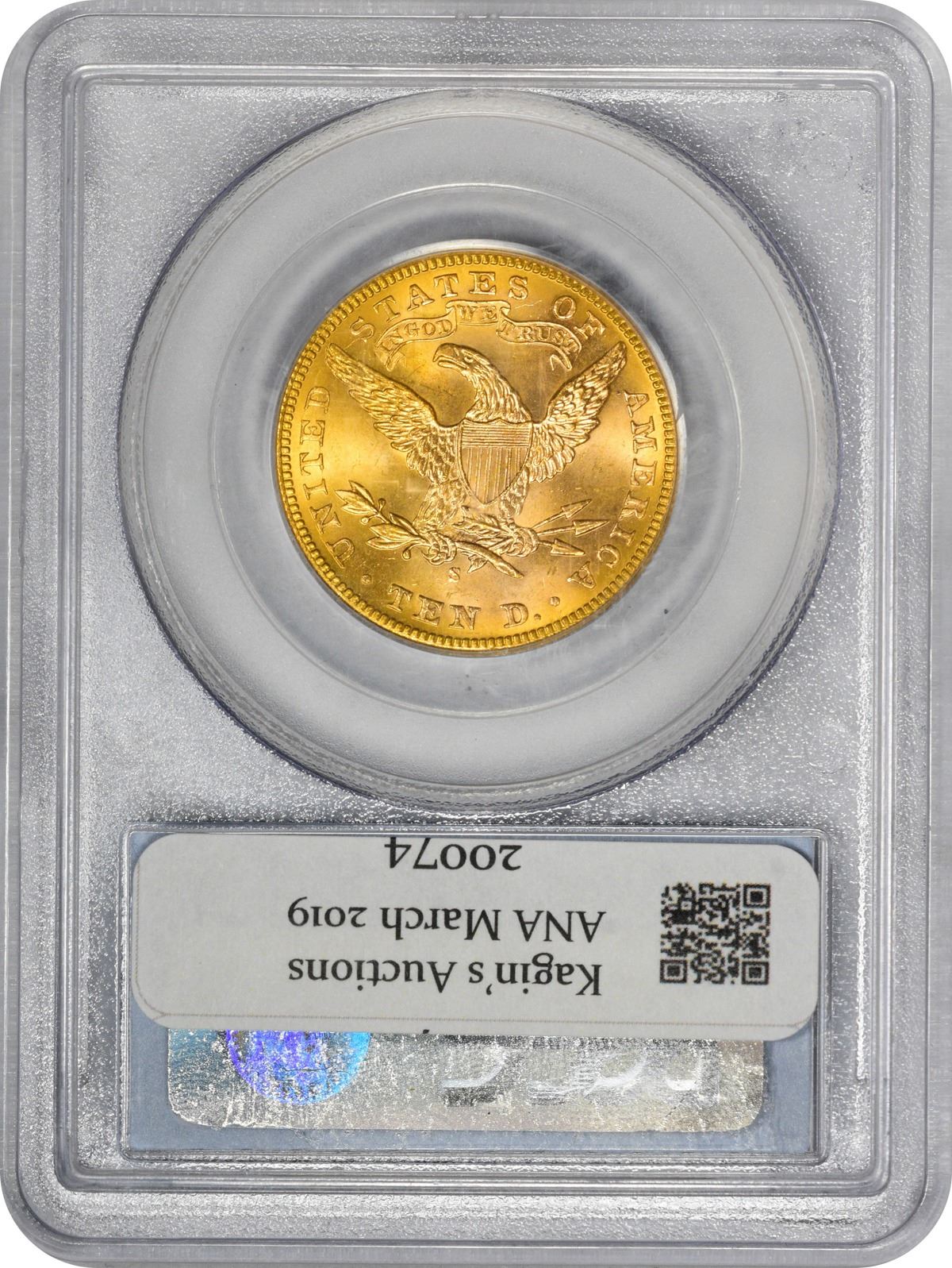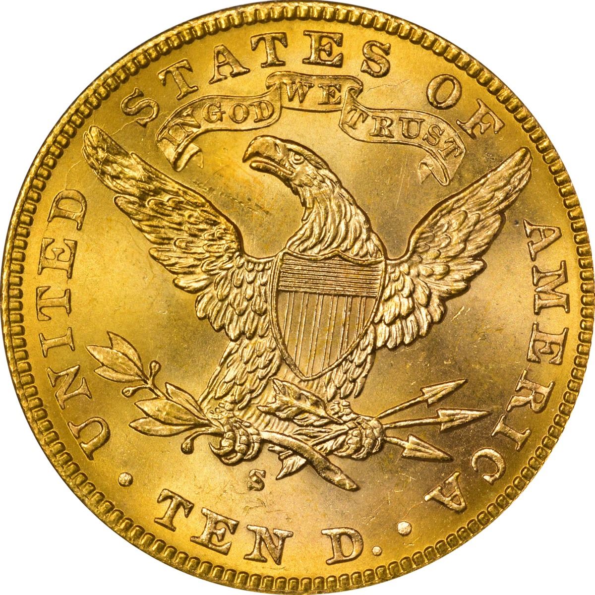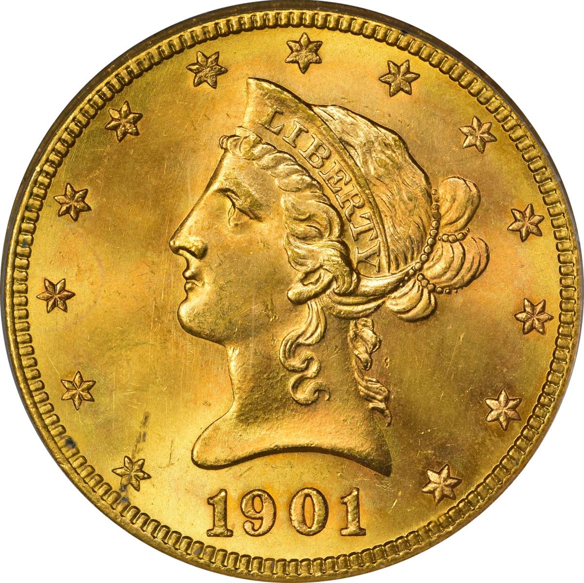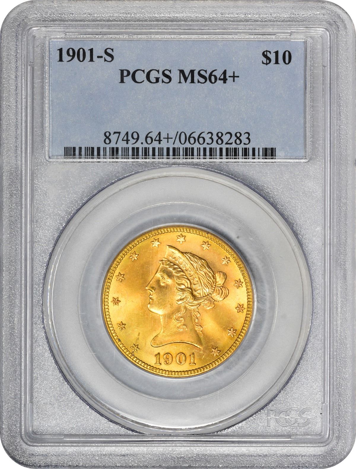Absolutely deserving of the “+” recognition from PCGS, this intensely lustrous near-gem is alive with cartwheel activity that supports wispy olive, rose, and peach iridescence on the deep honey-gold surfaces. A small grease streak at star 1, as struck, is the only mentionable mark the naked eye is apt to find. Quality and eye appeal -- what all collectors desire no matter the extent of their holdings. PCGS #8749