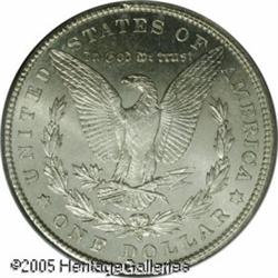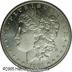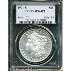 <B>1901-S<img border='0' src='http://www.heritagecoins.com/images/star.gif' width=10 height=10>$1 MS64 Prooflike PCGS.</B></I> Minimally abraded with a bright untoned appearance and typical softness over Liberty's ear. The reflective finish exhibited in the fields is anything but typical for the issue. Population: 5 in 64 Prooflike, 2 finer (1/05). Lot:10593