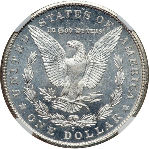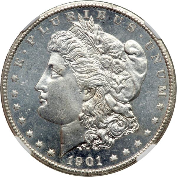 1901-S Morgan Dollar. NGC graded MS-65 Prooflike. Fully white. The fields ripple with original reflective luster. The 1901-S is a very challenging issue, the first of four difficult S-mint dates that conclude with the 1904-S. However, unlike most of the other survivors, which tend to be frosty, this lovely '01-S is not so readily obtainable in prooflike Mint State grades. Bright and highly lustrous, the striking details are sharp overall, if slightly unprotected above the ear, and there are no abrasions that require mention on either side save perhaps for a little contact point at Liberty's eyebrow. Pop 1; the finest PL graded at NGC (PCGS # 7277) .