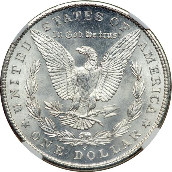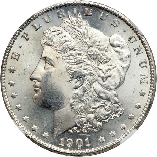 1901-S Morgan Dollar. NGC graded MS-65. A remarkable coin this is, blemish-free and glowing from top to bottom with silvery white frost. The strike, while almost 100% full, is clearly superior to the majority of '01-S Dollars, making this a solid Gem example of a desirable late date S-mint. Pop 82; 7 finer in 66 (PCGS # 7276) .