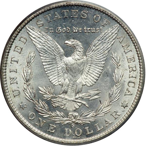 1901-S Morgan Dollar. PCGS graded MS-65. Well struck and mostly white. A sparkling coin bursting with luster, untoned and brilliant in appearance. The surfaces are clear of marks save for a couple of little ticks below the eye and a few grazes in the frost before the face. This minor points in no way remove the coin from easily satisfying the requirements for a Gem MS65 grade. The only weak spot in the strike is seen at the topmost hair curls above Liberty's ear. The eagle's breast (which sometimes mimics this weakness, is, on the contrary, as strongly detailed as any we have seen and makes this side of the coin all the more impressive. A worthy candidate! Pop 218; 28 finer, 27 in 66, 1 in 67 (PCGS # 7276) .