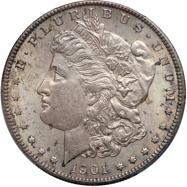 1901-S Morgan Dollar. PCGS graded MS-62. Nice even toning on both sides. For someone wanting a frosty example, this select MS62 will be more than suitable (PCGS # 7276) .
