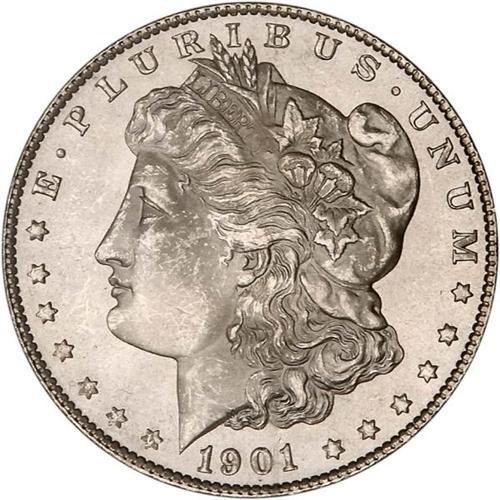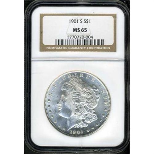 <b>1901-S Morgan Dollar. NGC graded MS65.</b> Fields of crystal, with frosted texture throughout like fine leaded glass. The coin is very lustrous and has no toning, a few bagmarks on the nose and cheek. What's more, this is a well struck example with ample detail to the high points, a trait that will likely yield a flush of bidding when it comes under the auction gavel <b>(PCGS # 7276)</b>