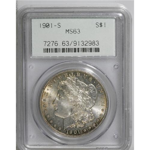 <B>1901-S<img border='0' src='http://www.heritagecoins.com/images/star.gif' width=10 height=10>$1> MS63 PCGS.</B></I> This coin's champagne and russet toning is restricted to the periphery. Nicely struck for this issue with good luster, though the abrasions one would expect for the grade are present.