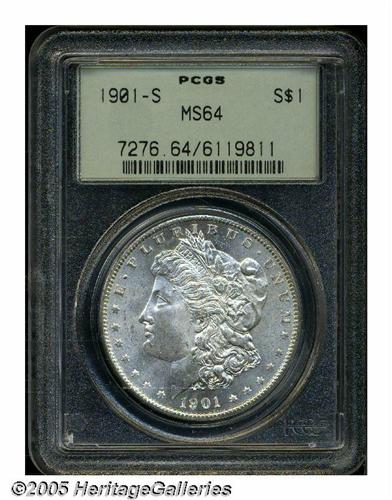 <B>1901-S<S$1> MS64 PCGS.</B></I> Nearly brilliant and solidly struck for this more challenging S-mint, with frosty features that are free from unsightly blemishes or roller marks. Most Uncirculated coins of this issue are in the MS 60 to MS62 range, and become scarcer in higher grades. Bowers (1993) estimates 3,000 to 6,000 pieces to have survived in MS64.