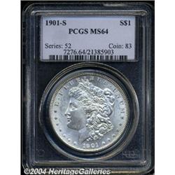 <B>1901-S<S$1> MS64 PCGS.</B></I> The 1901-S is one of the most difficult issues associated with the Redfield hoard, and apparently was widely circulated at the time of issue. While it is not always the case with Morgan dollars, the '01-S is actually most common in well worn condition. Uncirculated pieces are the rarest minted in San Francisco during the six-year period from 1897-1902. The surfaces on this outstanding example are satiny and virtually untoned, with strong central details. <BR><BR><B>Important notice:</B> Heritage usually auctions material at the rate of 200-250 lots per hour. On some occasions eBay Live bid software or the Internet may not be able to keep up with the pace of the auction. We recommend placing a realistic absentee bid now as insurance to avoid disappointment. Occasionally the auctioneer may eliminate or reject an eBay Live bid, and the auctioneer may also reopen a lot after the close of the eBay live bidding (usually because we missed an audience bid), and may reject your bid even if it shows you as the winning bidder. By bidding via eBay Live, you agree that Heritage may award the lot to another bidder at its sole discretion under the circumstances described above or any other reasonable circumstances. Since eBay bids are not shown to us until we open the lot on the floor, we treat those bids just like floor bids. In most cases the floor responds before the eBay bid is presented to us, due to Internet lag time, so for consistency we have made it a policy that floor bids are always considered first over tie eBay live bids. Also please note that all Heritage lots purchased through eBay Live carry a 20% Buyer's Premium. Please make sure you read the Terms and Conditions before you bid.