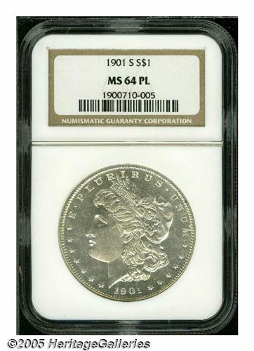 <B>1901-S<S$1> MS64 Prooflike NGC.</B></I> Lustrous, white example with light but attractive contrast. Well preserved, though some abrasions, particularly those on Liberty's chin, preclude a full-Gem designation.