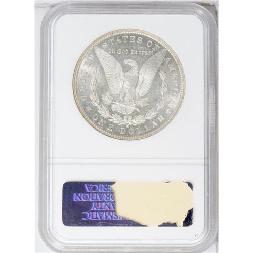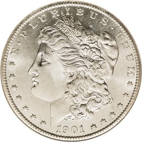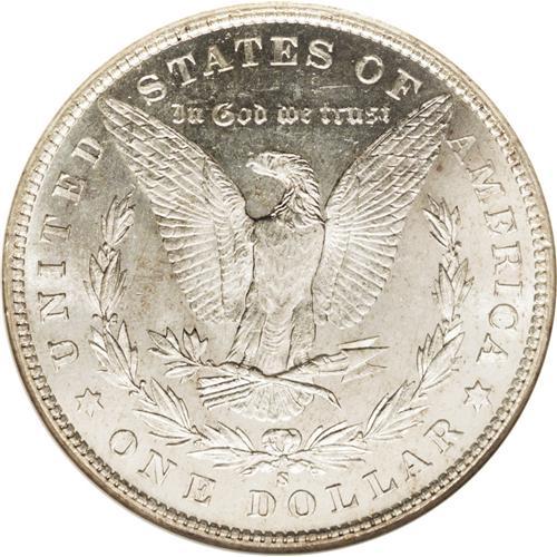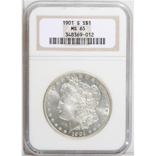 <B>1901-S<img border='0' src='http://www.heritagecoins.com/images/star.gif' width=10 height=10>$1> MS65 NGC.</B></I> Delicate chestnut-gold visits this mildly prooflike and attentively struck Gem. The preservation is exceptional except for an inconspicuous thin mark on the breast. Although the conditionally rare 1901 garners all the glory for this date, the 1901-S is a scarce issue in its own right, especially when compared with the common 1901-O. Encased in an earlier generation holder.