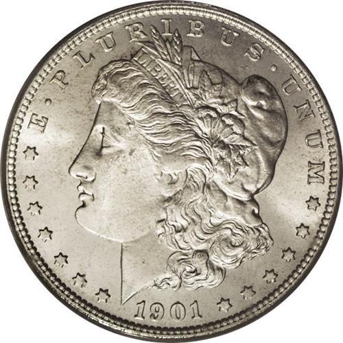 <B>1901-S<img border='0' src='http://www.heritagecoins.com/images/star.gif' width=10 height=10>$1> MS65 PCGS.</B></I> Essentially brilliant, the surfaces radiate contiguous mint frost at all angles. The strike is a little soft at the centers, but the smooth features more than uphold the grade. A conditionally scarce S-mint Morgan, the 1901-S is readily available in all grades short of Gem BU. Housed in an early PCGS holder with a green insert.<BR><I>From The Chicago-Ark Collection.</B></I>
