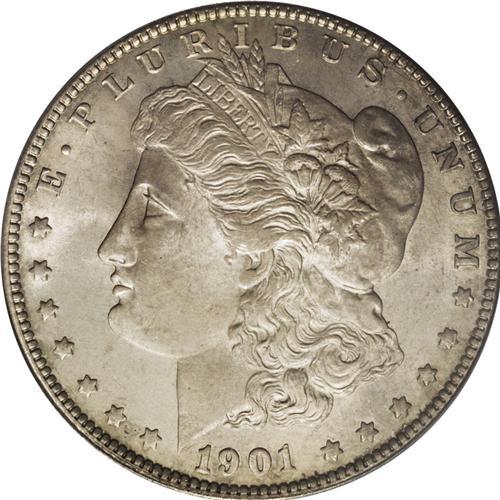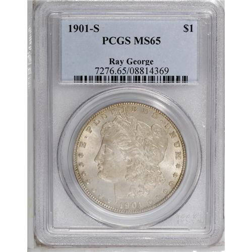 <B>1901-S S$1 MS65 PCGS.</B></I> Ex: Ray George. The silver-gray centers have a touch of blue and pink, while the peripheral toning is golden-orange. A handful of scattered marks appear in the fields, none of them overtly distracting. The soft and satiny luster is strong compared to many examples from the same issue. A worthy Gem from the first year of the 20th century.<BR><I>From The Cocoa Beach Collection.</B></I><BR><BR><b>Shipping:</b> Coin/Currency (<a target="_blank" href="http://www.heritageauctions.com/common/shipping.php">view shipping information</a>)