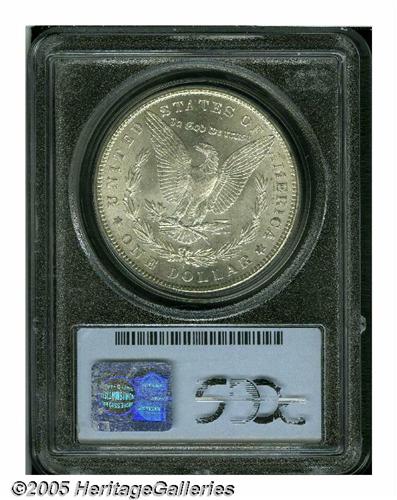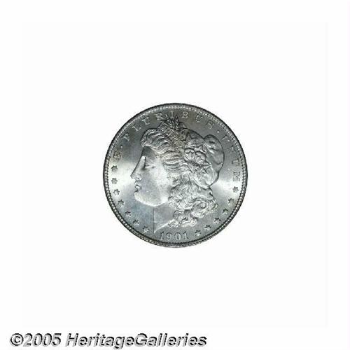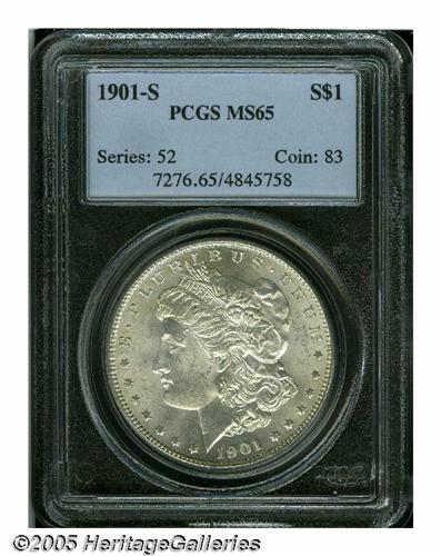 <B>1901-S<S$1> MS65 PCGS.</B></I> The 1901-S is one of the most difficult issues associated with the Redfield hoard and apparently was widely circulated at the time of issue. While it is not always the case with Morgan Dollars, the '01-S is actually quite common in well worn condition. Uncirculated pieces are the rarest minted in San Francisco during the six-year period from 1897-1902. PCGS has certified just 24 pieces higher than the MS65 specimen we offer here, and NGC has seen a mere 3 coins finer (6/05). The surfaces on this outstanding example are satiny and nearly untoned, with hints of golden peripheral color. The design elements are well struck, though the hair above Liberty's ear displays minor softness. A few minute marks on Liberty's cheek and the eagle's right wing are mentioned for accuracy.