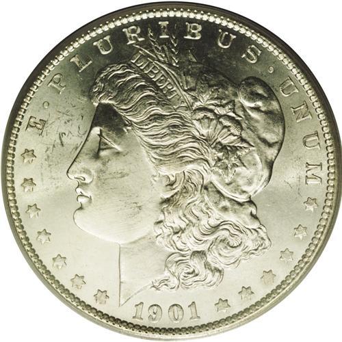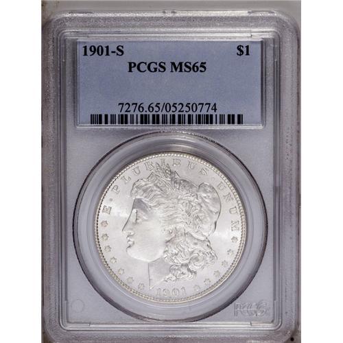 <B>1901-S<img border='0' src='http://www.heritagecoins.com/images/star.gif' width=10 height=10>$1> MS65 PCGS.</B></I> This is an elusive issue in Gem quality, and seldom encountered any finer. The present example has fully brilliant surfaces and sharp design elements, although the hair strands over Liberty's ear are a little weak as usual. Diagonal planchet rolling marks may be seen across the highest design points on the obverse. They are also visible to a lesser extent in the obverse fields near the devices. Population: 197 in 65, 25 finer (2/06).