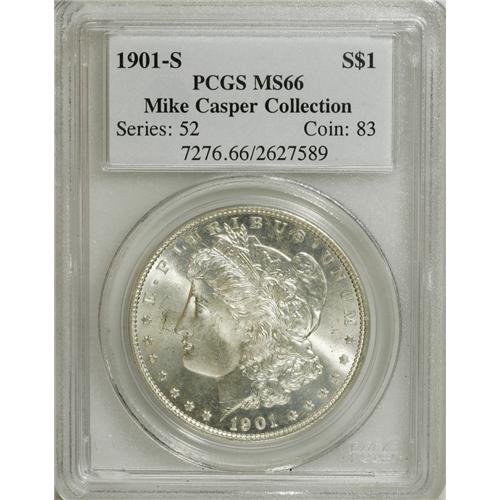 <B>1901-S S$1 MS66 PCGS.</B></I> Ex: Mike Casper Collection. The usual Mint State '01-S Dollar is moderately abraded, exhibits mushiness in the centers, and frequently displays roller marks across the portrait that further detract from both grade and eye appeal. As might be expected from the lofty grade of this piece, none of those negatives play any part in the appearance of this outstanding 1901-S Morgan. The surfaces display a mere wisp of golden toning, and offer scintillating cartwheel brilliance to complement the frosty, well struck devices. Contact marks are well scattered and trivial in both size and location. Population: 25 in 66, 1 finer (3/07).<BR><BR><b>Shipping:</b> Coins & Currency (<a target="_blank" href="http://www.heritageauctions.com/common/shipping.php">view shipping information</a>)