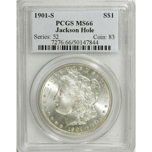 <B>1901-S S$1 MS66 PCGS.</B></I> Ex: Jackson Hole. The 1901-S is a conditionally challenging issue, the first of four difficult S-mint dollars that run through 1904. However, unlike the 1903-S and 1904-S, the '01-S is affordable and readily obtainable in lower Mint State grades. Apparently, enough of the coins were released from Federal vaults in the early 20th century to satisfy less selective collectors. However, sparkling better-than-Gem examples such as this piece are highly elusive. The striking details on this bright and exceptionally lustrous coin are well defined throughout, and there are no mentionable abrasions on either side. A superlative coin. Population: 25 in 66, 1 finer (2/07).<BR><I>From The Jackson Hole Collection.</B></I><BR><BR><b>Shipping:</b> Coins & Currency (<a target="_blank" href="http://www.heritageauctions.com/common/shipping.php">view shipping information</a>)