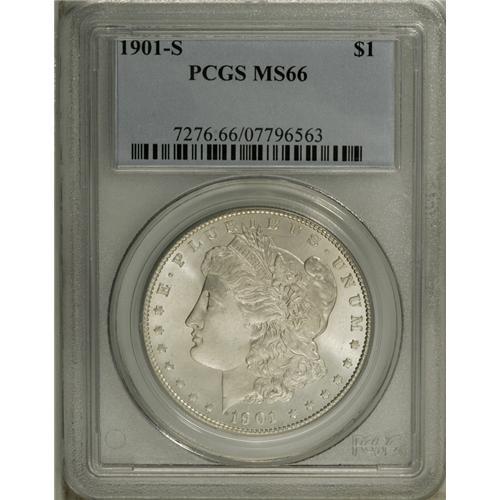 <B>1901-S S$1 MS66 PCGS.</B></I> This is an elusive date in Gem grade, and MS66 examples are suitable for the finest collections. In fact, PCGS has only certified one finer example of this date, thus only one collector can have a higher quality representative of this issue. A sharply struck piece, both sides exhibit fully frosty and lustrous surfaces with brilliant silver-white color that is accented by a splash of subtle champagne toning on the reverse. The surfaces have a few tiny marks that are consistent with the grade. Population: 25 in 66, 1 finer (11/06).<BR><BR><b>Shipping:</b> Coin/Currency (<a target="_blank" href="http://www.heritageauctions.com/common/shipping.php">view shipping information</a>)