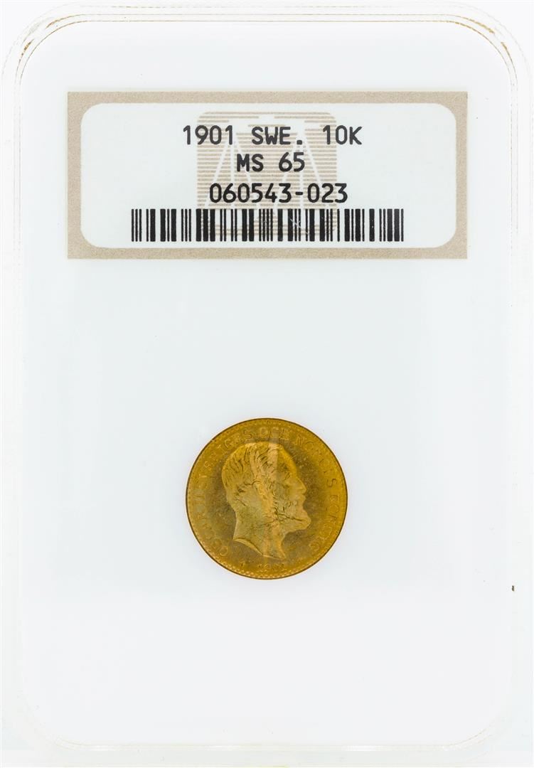 One 1901 Sweden 10 Kronor Gold Coin NGC MS65. NGC Certified.