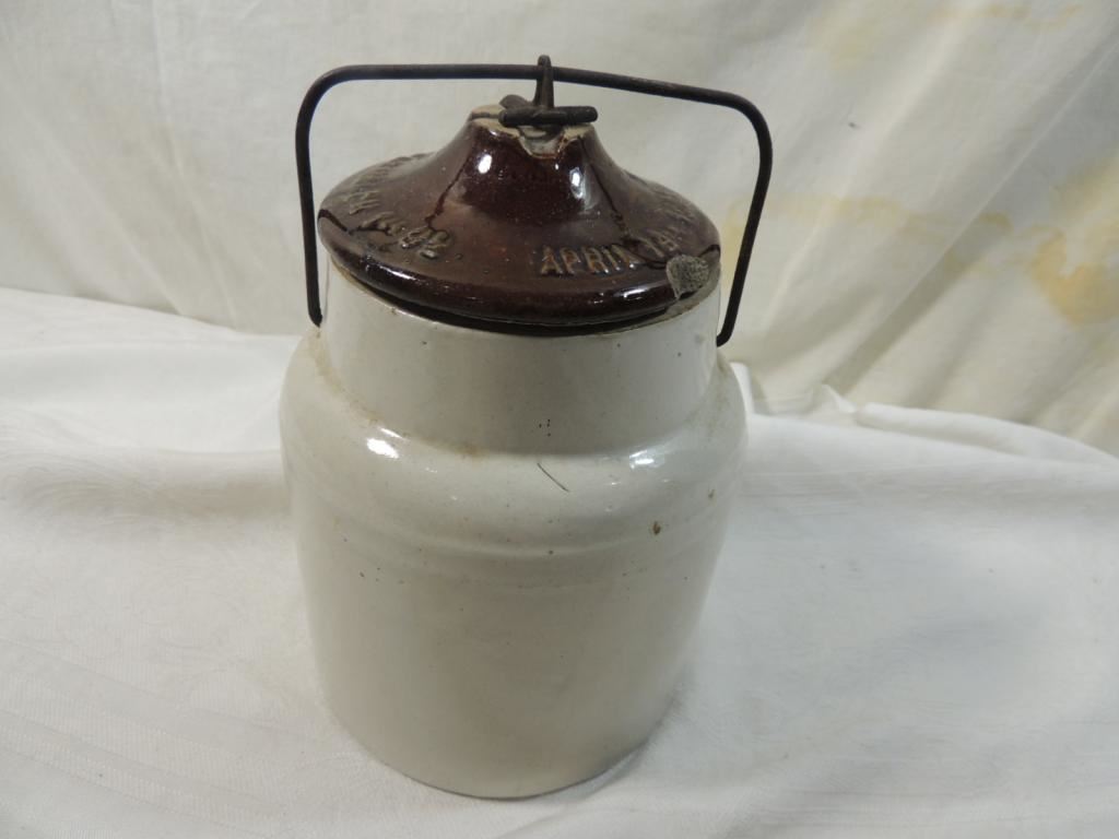 STONEWARE CROCK, STONEWARE CONTAINER, STONEWARE LOCKTOP JAR, PRIMIATIVE AS SHOWN SEE PHOTO FOR MORE DETAILS.