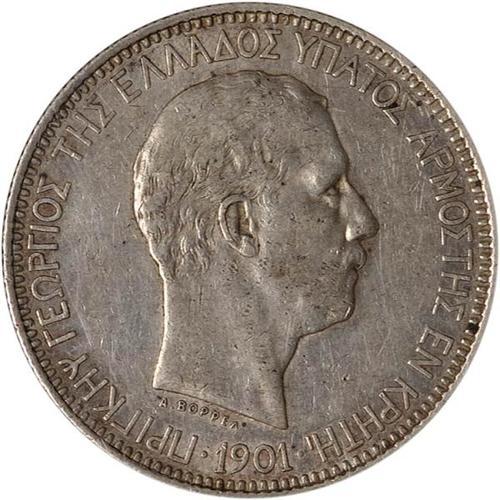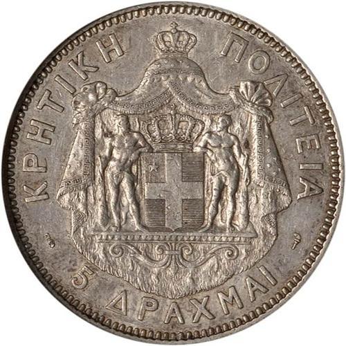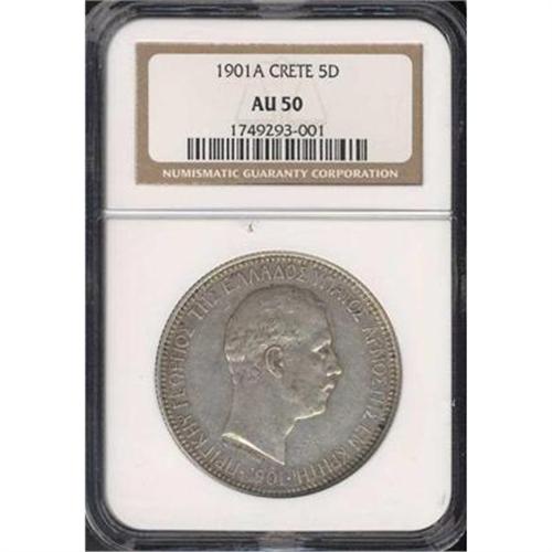 <b>1901A Crete 5D. NGC graded AU50.</b> Original uncleaned surface with light gray toning. Some luster evident on this large crown-sized coin of Crete in the Eastern Mediterranean.