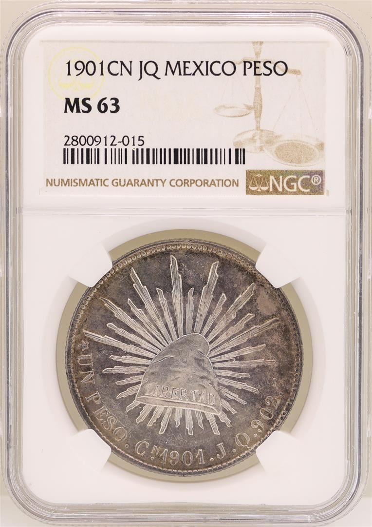 One 1901CN JQ Mexico Peso Coin NGC MS63. NGC Certified.