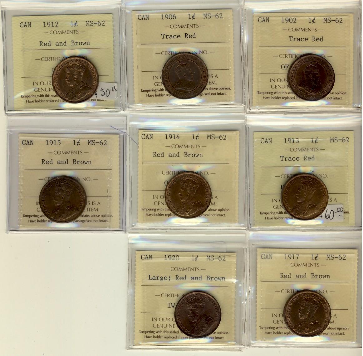 1902 1¢, 1906, 1912, 1913, 1914, 1915, 1917 & 1920 Lg ICCS MS62RB to Trace Red. Lot of 8 coins.