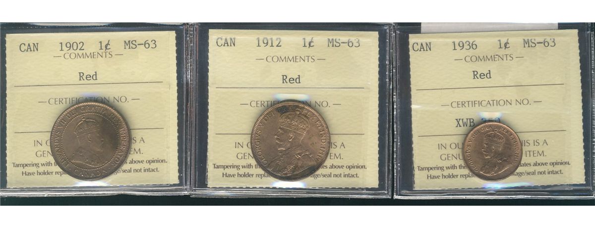1902 1¢, 1912 & 1936 ICCS MS63RD. Lot of 3 coins.