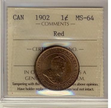 1902 1¢ ICCS MS64RD. 80% rd and lustrous.