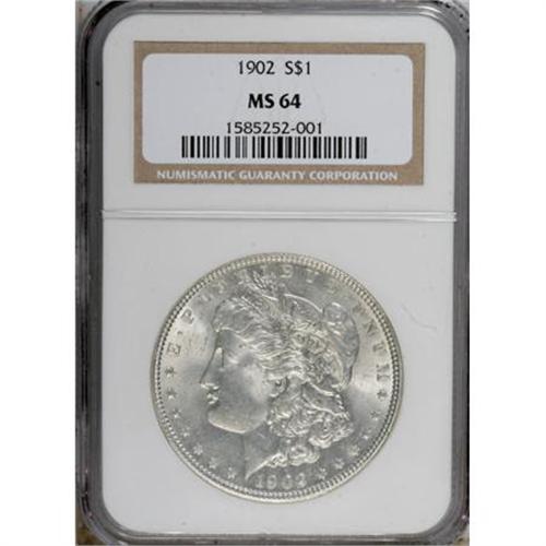 <B>1902 $1 MS64 NGC.</B></I> NGC Census: (1837/894). PCGS Population (1882/1467). Mintage: 7,994,777. Numismedia Wsl. Price for NGC/PCGS coin in MS64: $132. (#7278)<BR><BR><B>Coin Engraver:</B> George T. Morgan<BR><BR><b>Shipping:</b> Coins & Currency (<a target="_blank" href="http://www.heritageauctions.com/common/shipping.php">view shipping information</a>)