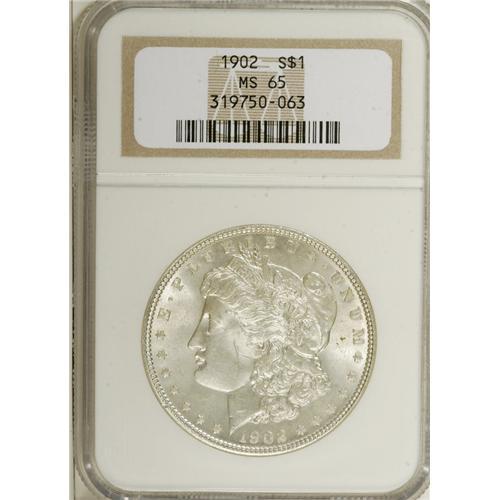 <B>1902 $1 MS65 NGC.</B></I> NGC Census: (1484/282). PCGS Population (1085/343). Mintage: 7,994,777. Numismedia Wsl. Price for NGC/PCGS coin in MS65: $372. (#7278)<BR><BR><b>Shipping:</b> Coins & Currency (<a target="_blank" href="http://www.heritageauctions.com/common/shipping.php">view shipping information</a>)