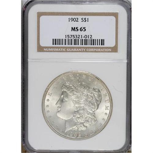 <B>1902 $1 MS65 NGC.</B></I> NGC Census: (748/145). PCGS Population (1084/343). Mintage: 7,994,777. Numismedia Wsl. Price for NGC/PCGS coin in MS65: $360. (#7278)<BR><BR><b>Shipping:</b> Coins & Currency (<a target="_blank" href="http://www.heritageauctions.com/common/shipping.php">view shipping information</a>)