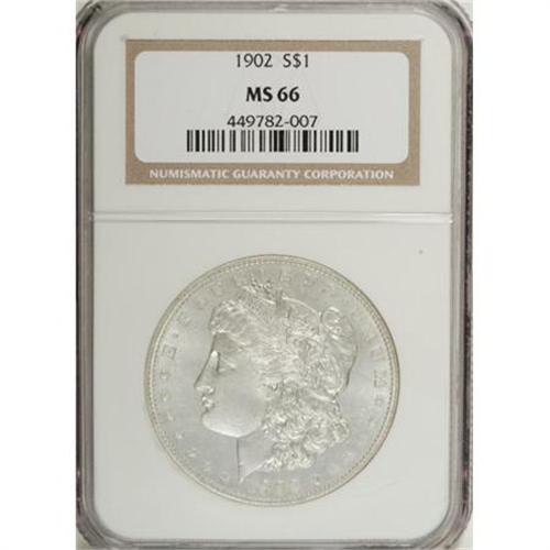 <B>1902 $1 MS66 NGC.</B></I> <B>1902 S$1 MS66 NGC.</B></I> An untoned and semi-prooflike example of this conditionally rare Philadelphia issue. The cheek and fields are refreshingly void of bagmarks, and the strike is full. <BR><BR><b>Shipping:</b> Coins & Currency (<a target="_blank" href="http://www.heritageauctions.com/common/shipping.php">view shipping information</a>)