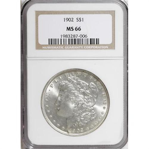 <B>1902 $1 MS66 NGC.</B></I> Bright luster emanates from both sides of this untoned Premium Gem. Well struck, and showing just a few minute marks that may preclude an even higher grade.<BR><I>From The Silver Spur Collection of Morgan Dollars.</B></I><BR><BR><B>Coin Engraver:</B> George T. Morgan<BR><BR><b>Shipping:</b> Coins & Currency (<a target="_blank" href="http://www.heritageauctions.com/common/shipping.php">view shipping information</a>)