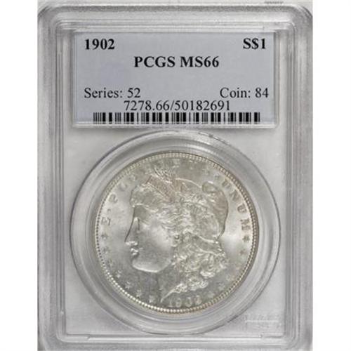 <B>1902 $1 MS66 PCGS.</B></I> A pleasingly detailed P-mint piece that offers lovely luster beneath delicate layers of silver-gray toning with a touch of gold. Despite its status as one of the more available early 20th century Morgan issues, the 1902 is challenging in better Mint State grades; PCGS has graded just 18 finer pieces (10/07).<BR><BR><B>Coin Engraver:</B> George T. Morgan<BR><BR><b>Shipping:</b> Coins & Currency (<a target="_blank" href="http://www.heritageauctions.com/common/shipping.php">view shipping information</a>)
