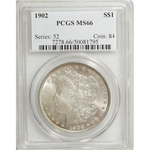 <B>1902 $1 MS66 PCGS.</B></I> The right side of the obverse has pale lilac toning. The balance of the obverse and the reverse are mostly brilliant, with a faint trace of color.<BR><BR><B>Coin Engraver:</B> George T. Morgan<BR><BR><b>Shipping:</b> Coins & Currency (<a target="_blank" href="http://www.heritageauctions.com/common/shipping.php">view shipping information</a>)