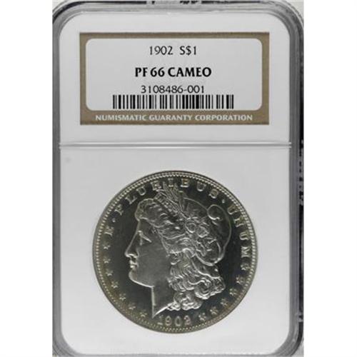 <B>1902 $1 PR66 Cameo NGC.</B></I> Cameo proof 1902 Morgans are unusual, which makes the Premium Gem offering in this lot rather special. The reason for the infrequent appearance of this issue in Cameo contrast is succinctly put by David Bowers in his 1993 silver and trade dollar reference: "In keeping with Proof dollars of the next two years, Proofs of 1902 are of low contrast due to having the dies polished on the devices. This feature recurs on practically all Proofs 1902-1907."<BR> The rarity of 1902 Cameo dollars is evident from the population data. NGC and PCGS have certified a mere eight examples combined. NGC has graded four PR66 Cameo coins and two PR65s, while PCGS has seen one Proof 64 and one PR65. <BR> The deep mirrors of this PR66 establish strong contrast with the motifs. The only color apparent is an occasional barely discernible wisp of reddish-gold in the margins, and a well directed strike brings out strong definition on the devices. The only mark evident on the impeccably preserved surfaces occurs on the lower cheek, and the only reason for its mention is for pedigree identification purposes.<BR><BR><b>Shipping:</b> Coins & Currency (<a target="_blank" href="http://www.heritageauctions.com/common/shipping.php">view shipping information</a>)