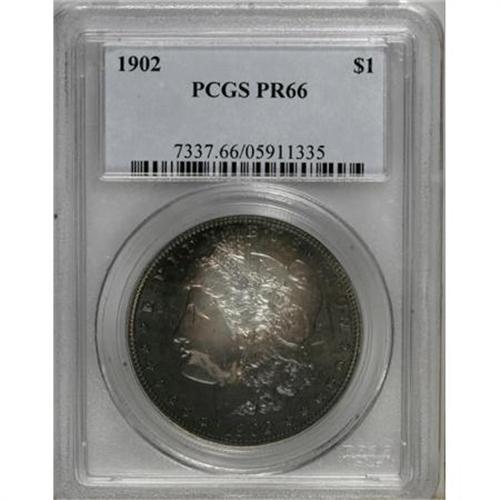 <B>1902 $1 PR66 PCGS.</B></I> Boldly impressed overall, though the hair above Liberty's ear shows a whisper of softness. Ample mirrors shine through on the unpatinated central areas, while deep violet and olive toning embraces the rest of the coin. An uncommonly well-preserved specimen from the later years of the proof Morgan dollar series. Population: 16 in 66, 5 finer (3/08).<BR><BR><B>Coin Engraver:</B> George T. Morgan<BR><BR><b>Shipping:</b> Coins & Currency (<a target="_blank" href="http://www.heritageauctions.com/common/shipping.php">view shipping information</a>)