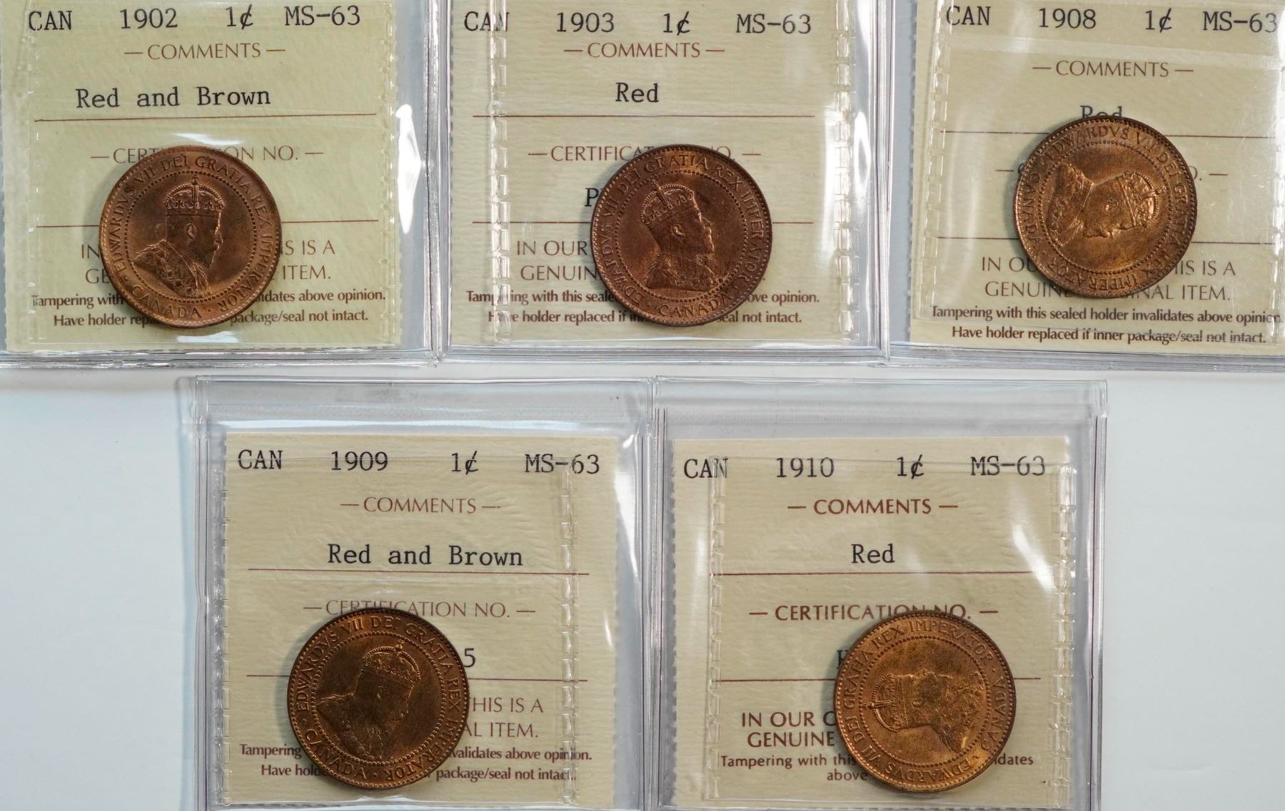 1902 1¢ RB, 1903 RD, 1908 RD, 1909 RB, and 1910 RD, all ICCS Choice Mint State-63, lot of 5 coins.