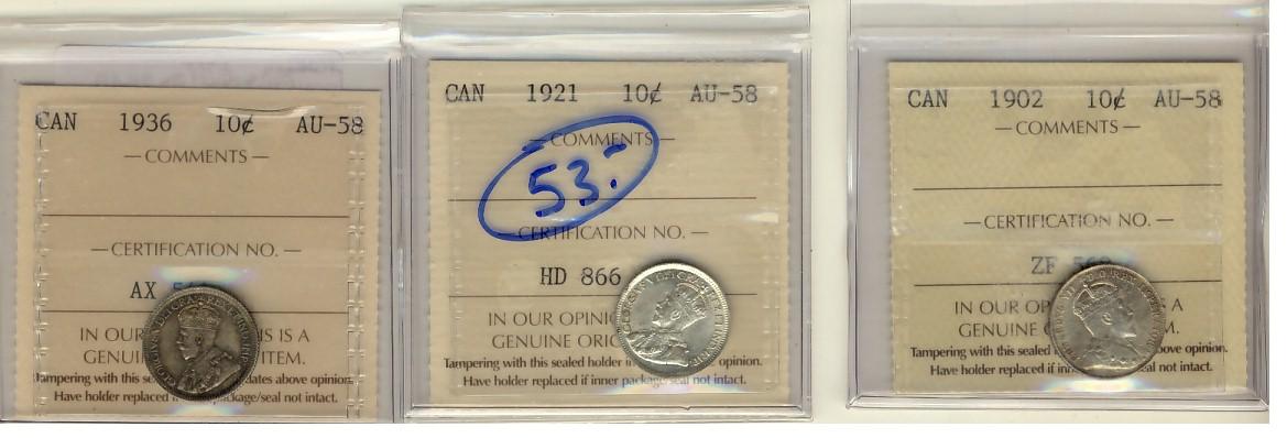 1902 10¢, 1921 & 1936 10¢ ICCS AU58. Lot of 3 coins.