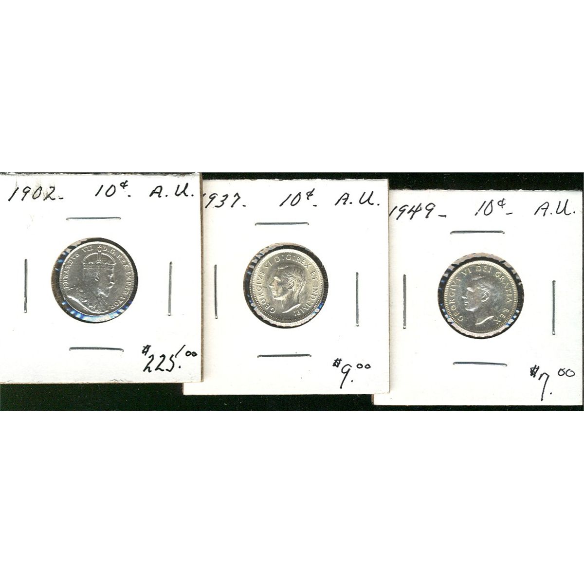 1902 10¢, 1937 & 1949 Brilliant AU. Lot of 3 coins. (PBA).