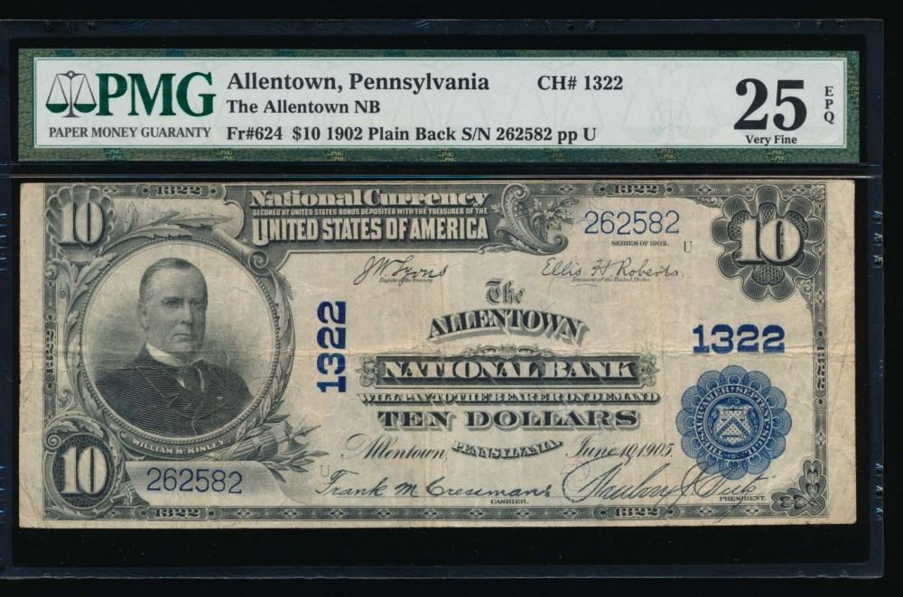 One 1902 $10 Allentown National Bank Note PMG 25EPQ.