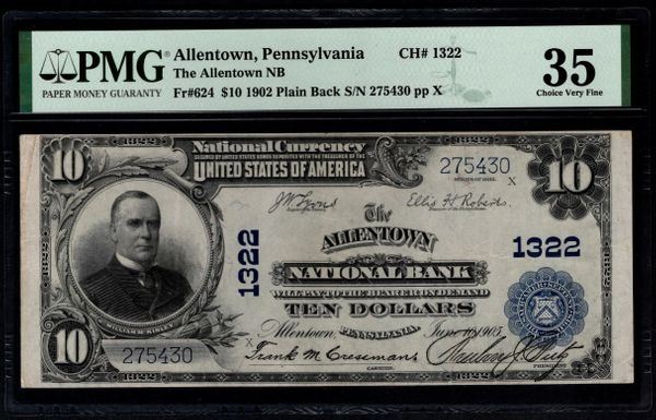 One 1902 $10 Allentown National Bank Note PMG 35.
