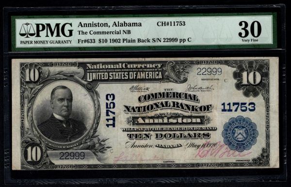 One 1902 $10 Anniston National Bank Note PMG 30.