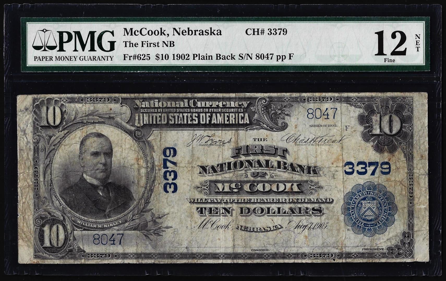 One 1902 $10 First NB of McCook, Nebraska CH# 3379 National Currency Note PMG Fine 12 Net. PMG Certified.