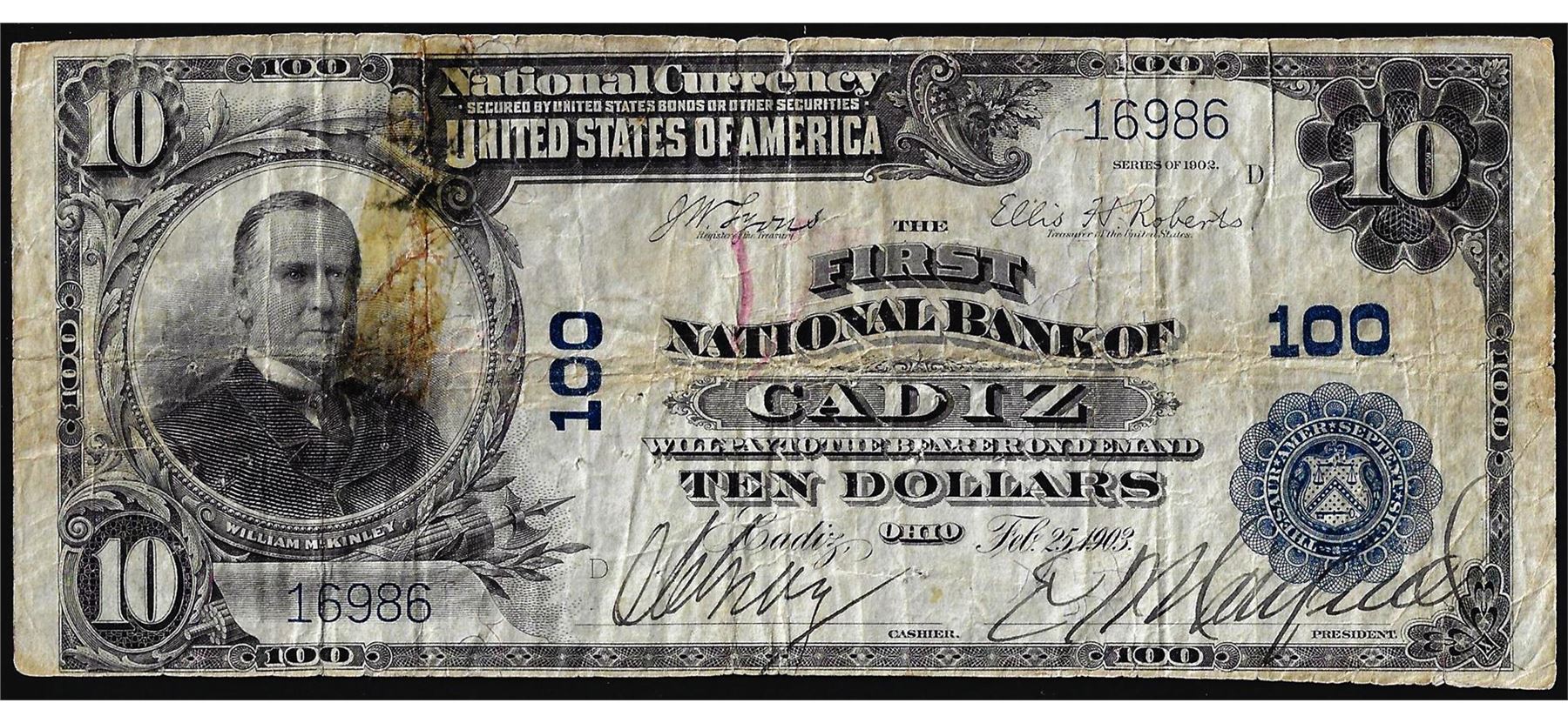 One 1902 $10 First National Bank of Cadiz Ohio CH# 100 National Currency Note.