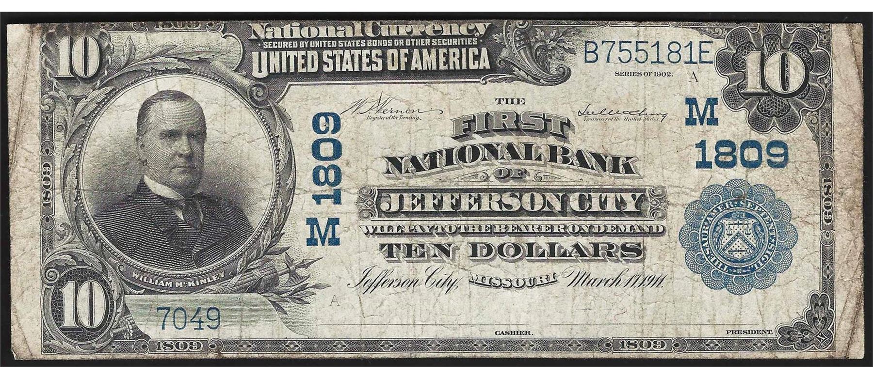 One 1902 $10 First National Bank of Jefferson City Currency Note CH# 1809.