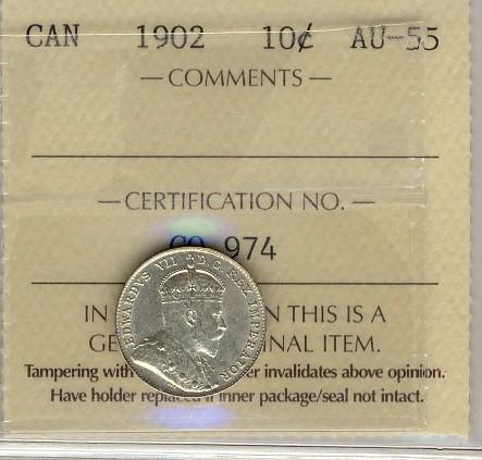 1902 10¢ ICCS AU55. Nice lustrous coin.