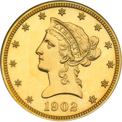 1902 $10 Liberty. NGC graded Proof 65. Both sides are smoothly mirrored in the familiar "all brilliant" finish of 1902, with bright, reflective fields supporting sharp, crisp devices. Even yellow-gold color is seen throughout. Fortunately for bidders, there are no blemishes found, nor is there anything else that is worthy of note in a negative way. Instead, the entire coin is exemplary in its detail, beauty, originality. With such strong technical merits and captivating eye appeal, this coin would serve as a centerpiece in even the most advanced collection of U.S. Proof gold. 113 Proofs struck. Extremely low population at this grade level: Pop 2; 3 finer; 1 in 66; 2 in 67. (PCGS # 8842).