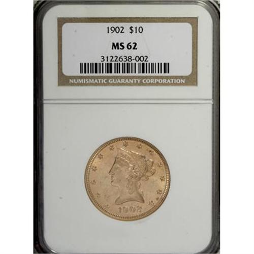 <B>1902 $10 MS62 NGC.</B></I> . NGC Census: (194/77). PCGS Population (144/98). Mintage: 82,400. Numismedia Wsl. Price for NGC/PCGS coin in MS62: $510. (#8750)<BR><BR><B>Coin Engraver:</B> Christian Gobrecht<BR><BR><b>Shipping:</b> Coins & Currency (<a target="_blank" href="http://www.heritageauctions.com/common/shipping.php">view shipping information</a>)