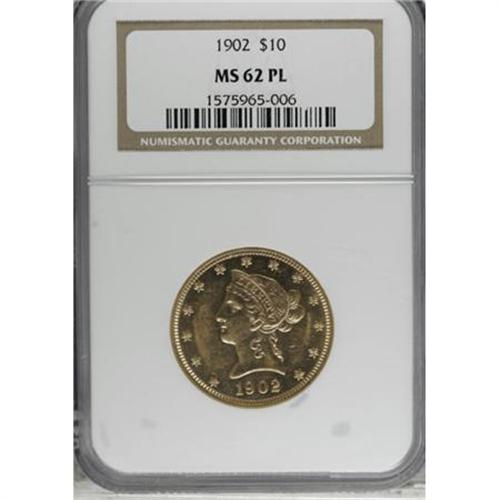 <B>1902 $10 MS62 Prooflike NGC.</B></I> Apparently the first 1902 to receive a Prooflike designation, since the (8/07) NGC Census shows no such pieces. Precisely struck and surprisingly clean for the grade. A low mintage date.<BR><BR><B>Coin Engraver:</B> Christian Gobrecht<BR><BR><b>Shipping:</b> Coins & Currency (<a target="_blank" href="http://www.heritageauctions.com/common/shipping.php">view shipping information</a>)