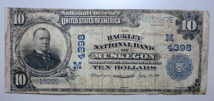 1902 $10 MUSKEGON MI. HACKLEY BANK VG-F